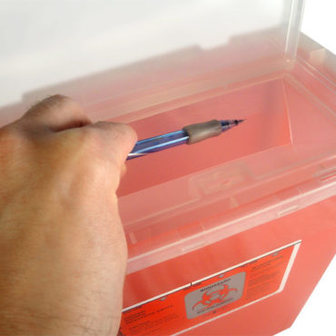 A case of our 3 gallon Bemis sharps containers. These three gallon containers with a wide-mouth opening are designed for restricted access high-volume areas such as ICU and ER. Built-in needle key for safe removal of needles. (15 in. L x 6.5 in. W x 15 in. H)