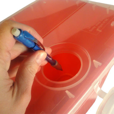 8 gallon Bemis sharps container. This large capacity container is designed for areas that demand constant, large-volume disposal of infectious sharps waste. (Pharmacy, OR, lab, dialysis, ER, etc.) Lid features two opening options: Lid lifts for large items while a small opening allows disposal of needles and other small-items. (12 in. L x 16 in. W x 16 in. H)